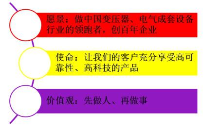 公司企业文化建设分为宣传发动、组织实施、深入践行三个阶段。成立了“企业文化建设领导小组”,组织员工学习知名企业文化案例;召开“企业文化”研讨会,剖析、梳理文化积淀,确定企业文化定位。经过问卷调查、文化现状分析、总结提炼、意见反馈、补充完善等一系列程序,确定了公司的使命、愿景和价值观,提出了“诚信、创新、拼搏、团结”的企业精神和“做中国变压器、电气成套设备行业的领跑者”的宏伟目标,营造了以人为本、依法经营的良好环境。